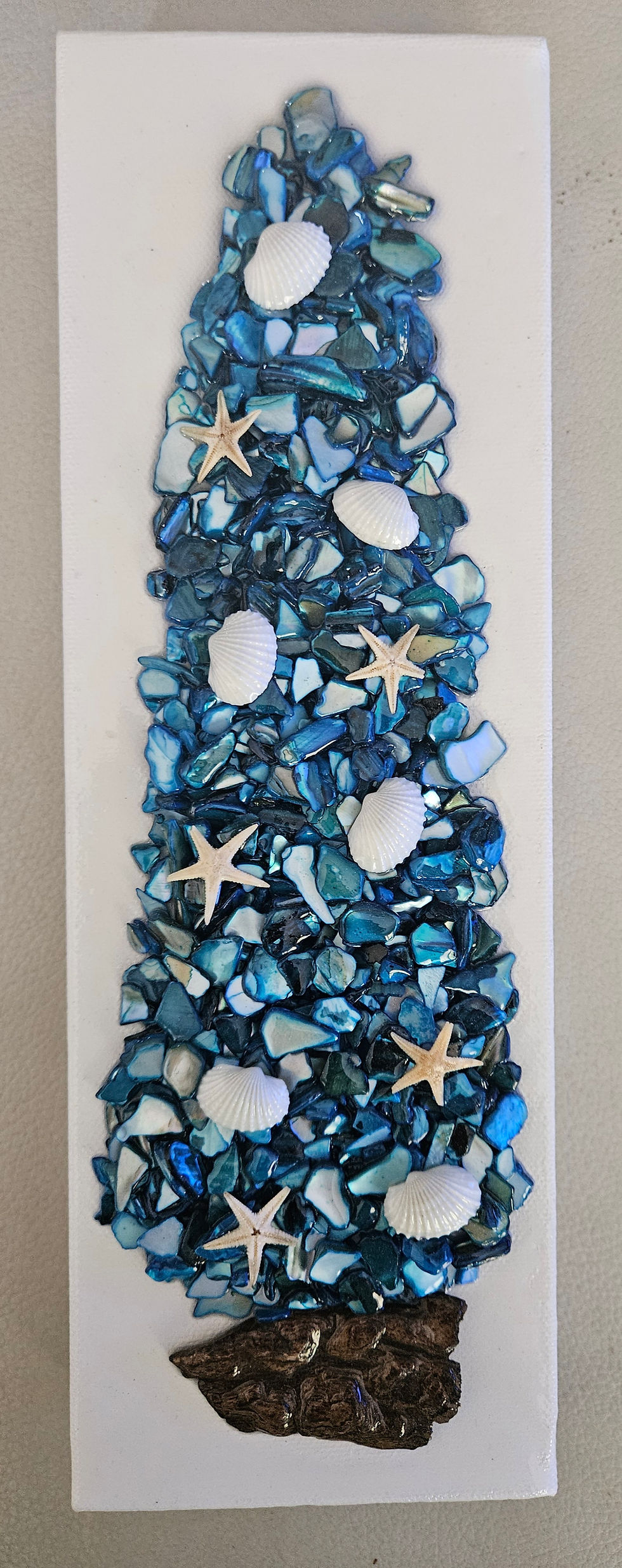 Crushed shells in many different colors with seashell, starfish and turtle embellishments in resin.