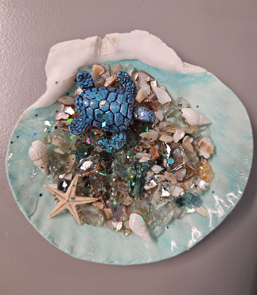 Crushed shells in many different colors with seashell, starfish and turtle embellishments in resin.