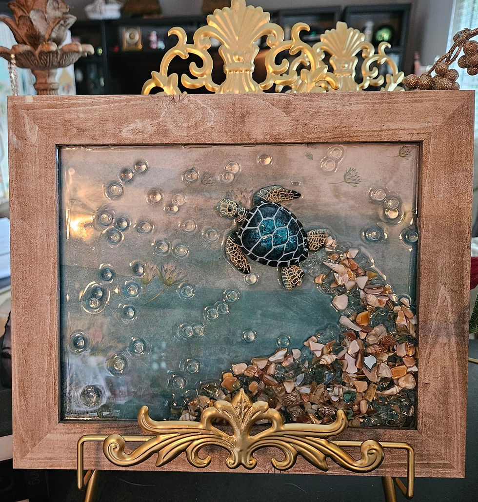 Crushed shells in many different colors with seashell, starfish and turtle embellishments in resin.…